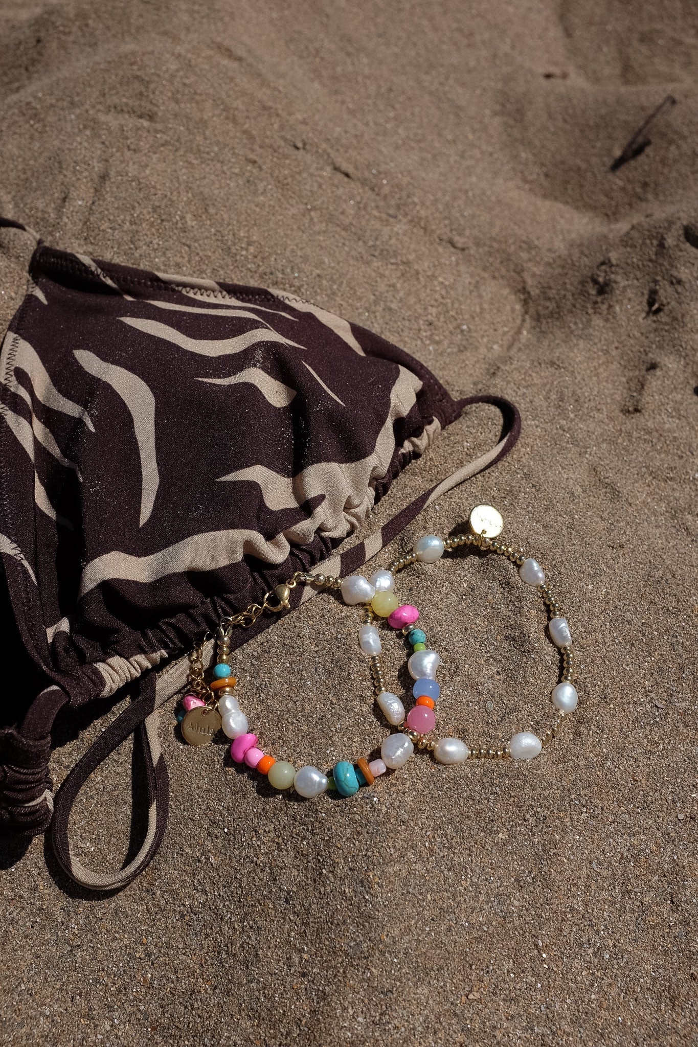Your colourful beaded pieces are best left on dry land- salt water, moisturisers and chemicals will fade their brightness, so keep them away from the waves to preserve their glow✨