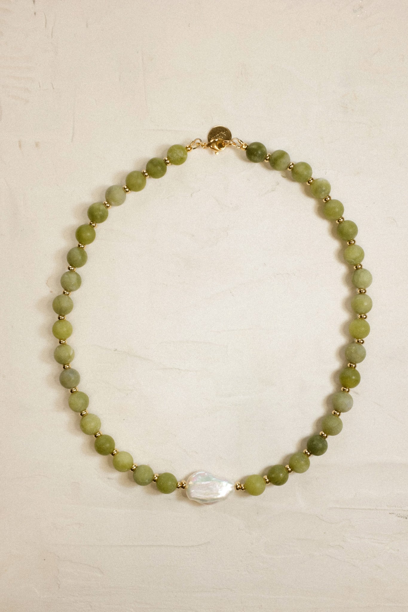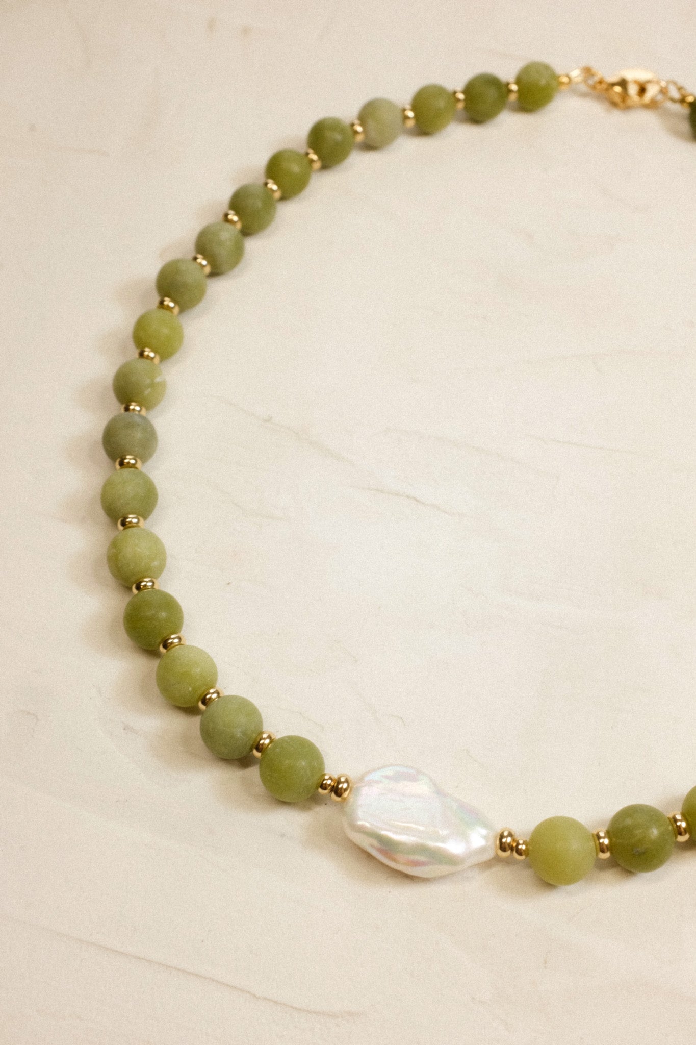 Made from serpentine beads, PVD 18k gold spacers and a gorgeous Keshi Pearl. This necklace is hand strung to order just for you. The beads are a mix of greens and have an organic matt texture to them.