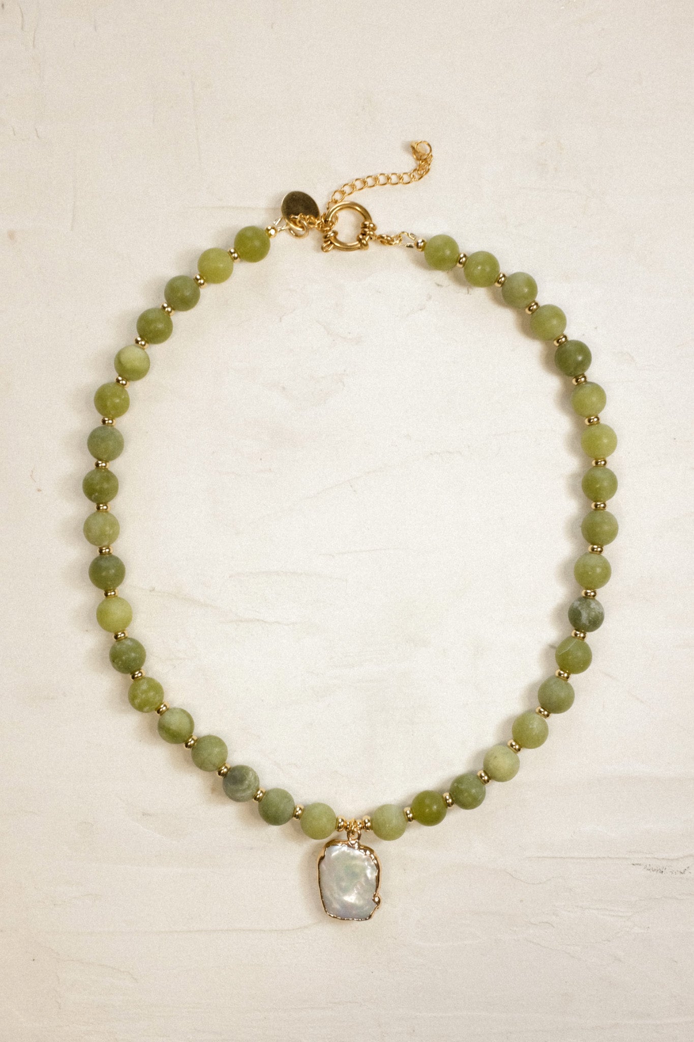 One off piece made from our serpentine green bead, PVD 18ct Gold plated spacers and an electroplated gold plated unique pearl pendant. This is a gorgeous one of a kind piece made for someone pretty special